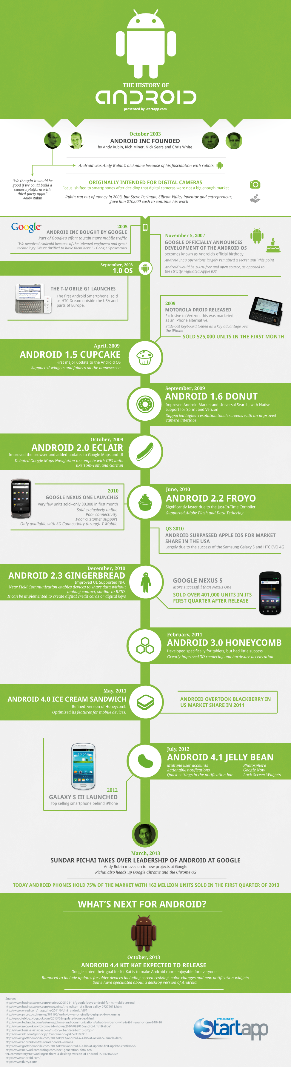 De cualquier forma es una bendición o maldición (?) que exista un sistema operativo no tan libre como se creía, pero mientras haga que los equipos con el sean más accesibles que la competencia, es bienvenido. La historia de Android se remonta años atrás antes de su adquisición por parte de Google, en la excelente infografía a continuación pueden descubrir sus inicios como sistema enfocado solo para cámaras fotográficas y posteriormente evolución hasta convertirse en el sistema instalado en millones y millones de dispositivos móviles en el mundo.
