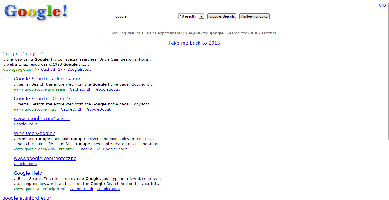 Lo más apreciable es que si lo comparas con el diseño actual, todavía se conserva la estructura básica de la página: el omnipresente logo en la esquina superior izquierda, al lado el buscador y debajo los resultados, separado por una delgada línea. El diseño de los resultados si ha cambiado, la URL antes se mostraba al final del extracto del resultado.