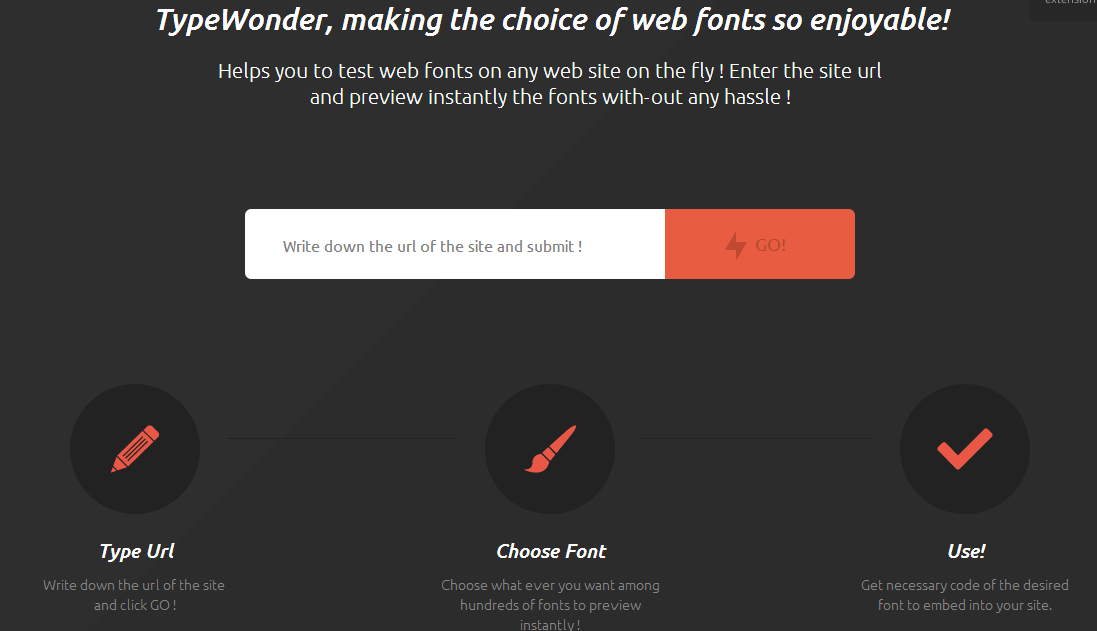 TypeWonder es realmente sencilla, solo basta con escribir la URL, seleccionar la fuente que deseas probar y ya esta, el sitio te cargará con la fuente que elegiste, más fácil imposible, si tal vez cambiaste de parecer, puedes elegir otra fuente desde el botón de la esquina superior derecha.